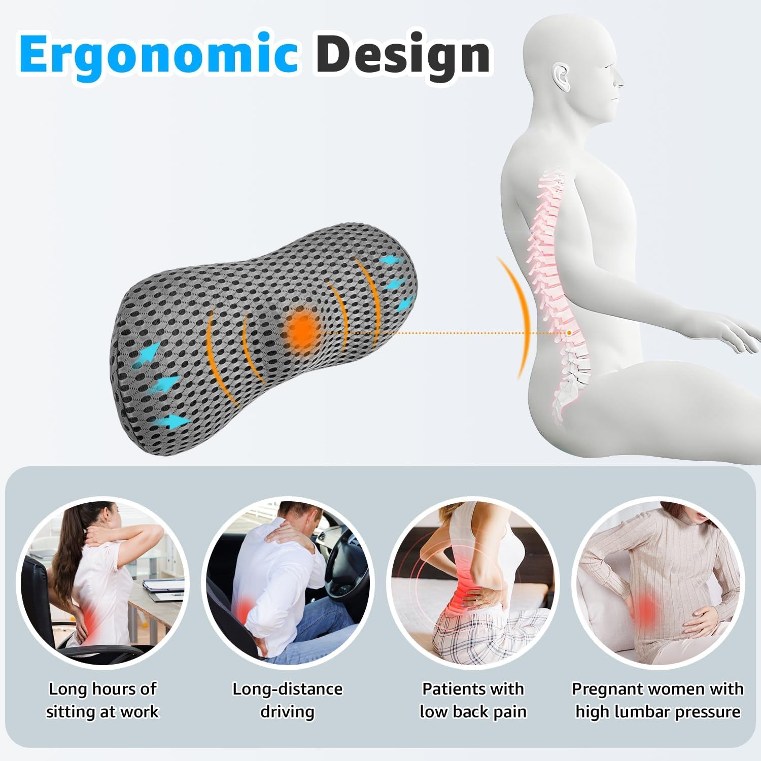 - DISEÑO ERGONÓMICO: La almohada de soporte lumbar para automóvil tiene un diseño ergonómico que brinda un buen soporte para la cintura y la espalda, relaja la columna y es muy útil para aliviar el dolor y las molestias de espalda.