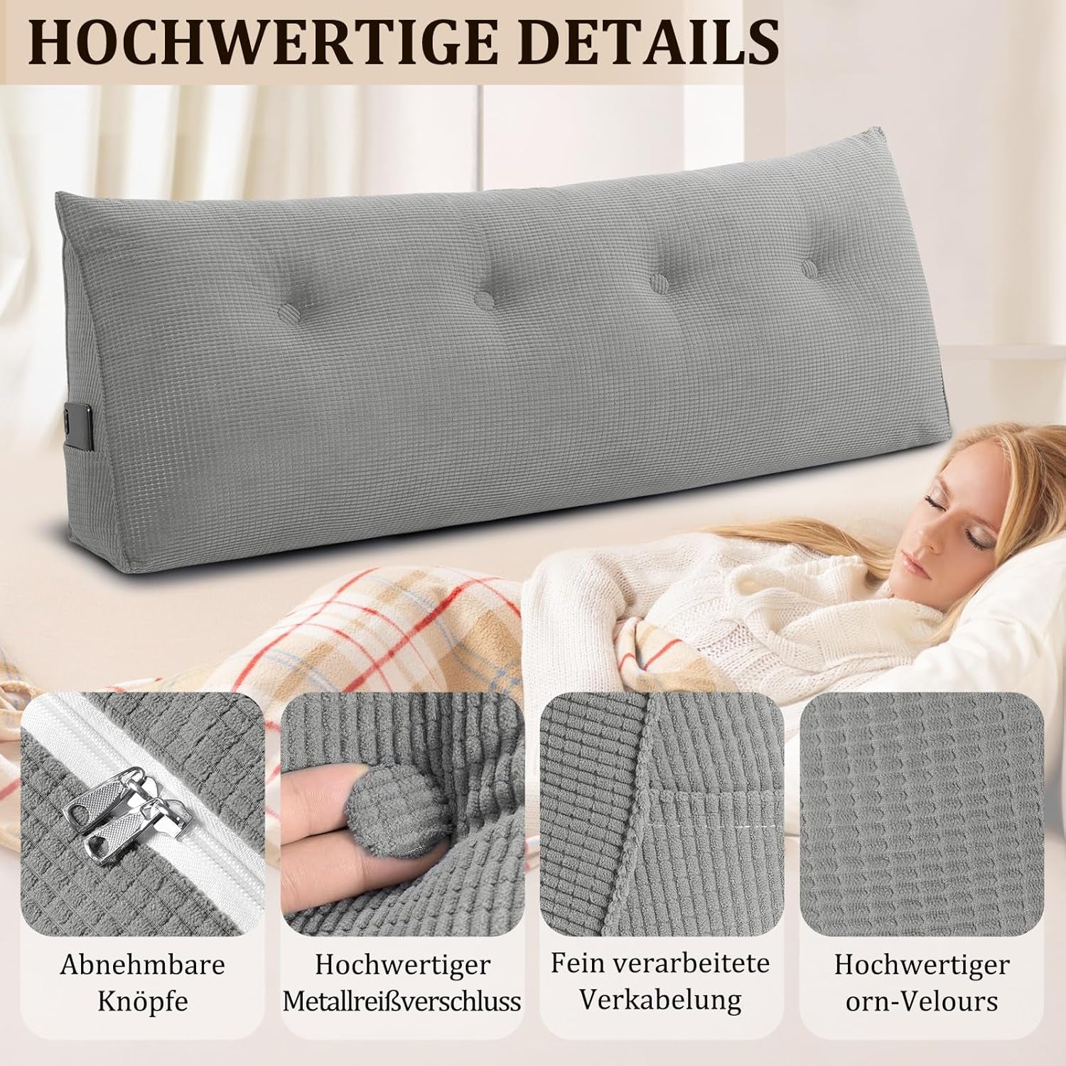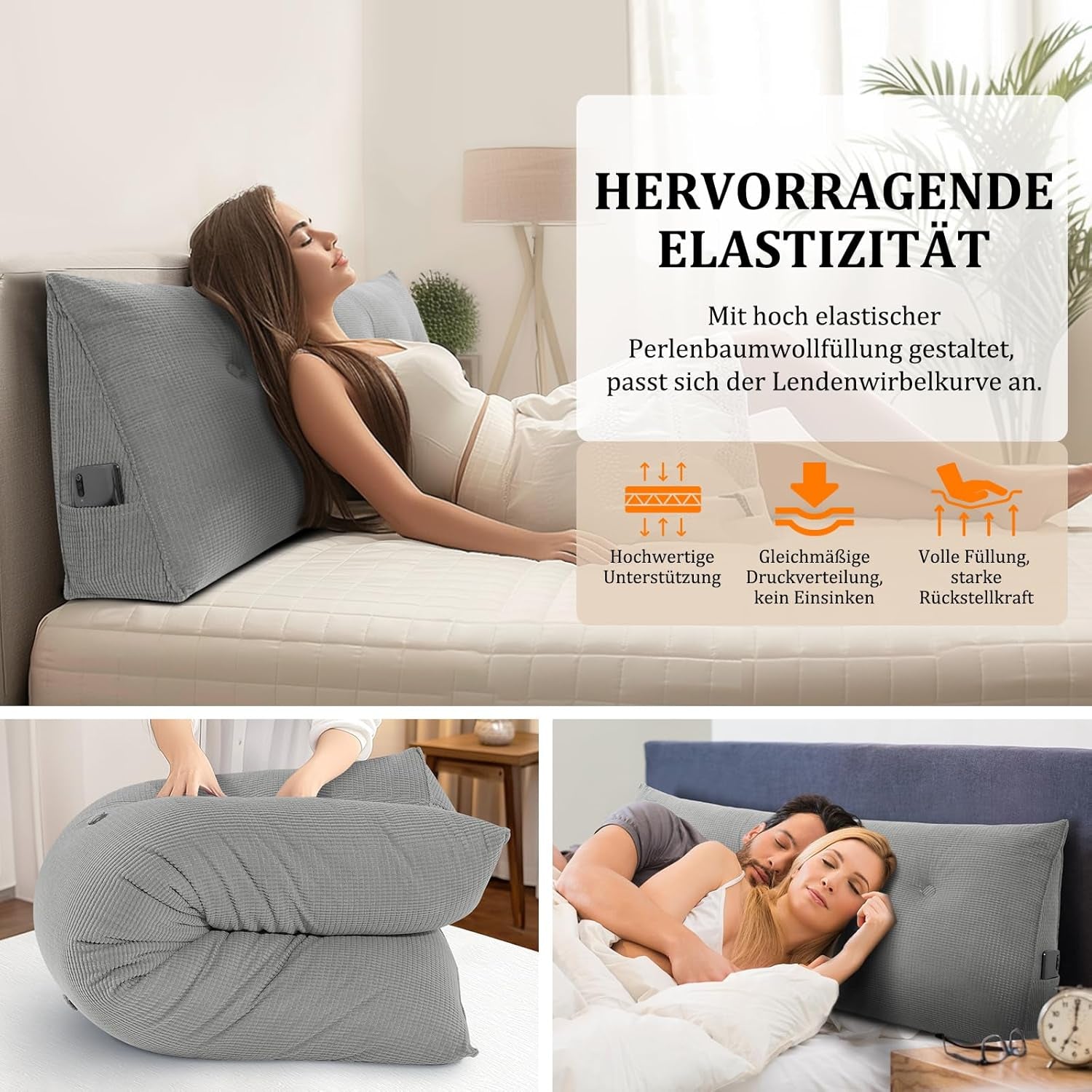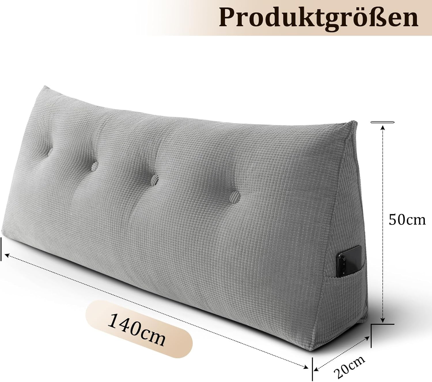 Almohada de espalda, almohada de lectura para cama y sofá, 140 cm - cómoda almohada de pared para la cama, proporciona un soporte óptimo para la almohada de espalda de la cama, almohada de cama con prácticos bolsillos laterales, gris,