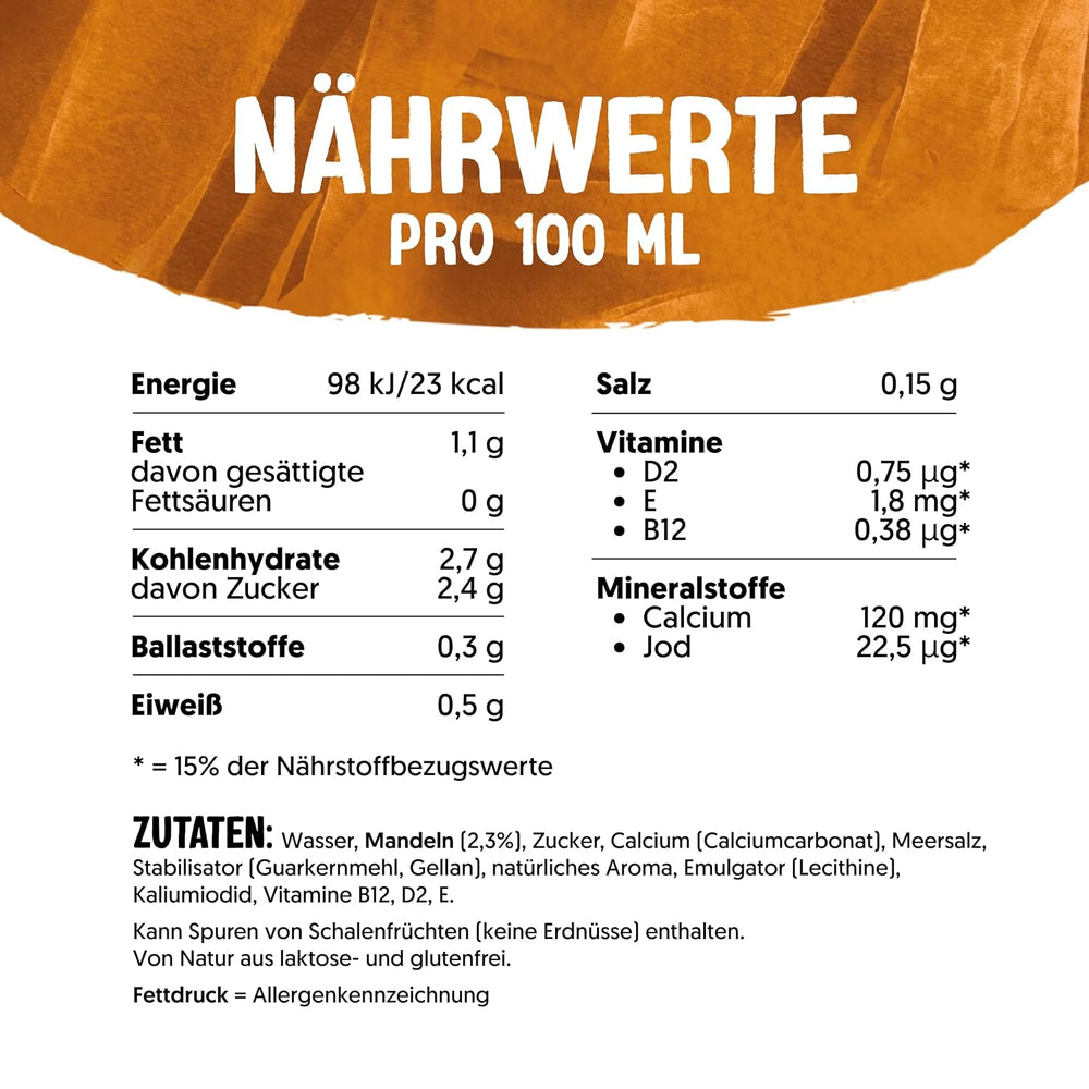 Alpro Mandeldrink Ohne Zucker es una bebida de almendras a base de plantas para quienes desean una opción sin azúcar, lácteos ni gluten, manteniendo un sabor rico y cremoso. Enriquecido con calcio y vitaminas esenciales, es apto para toda la familia, en la dieta diaria o como alternativa a la leche en el café, los cereales o el té.