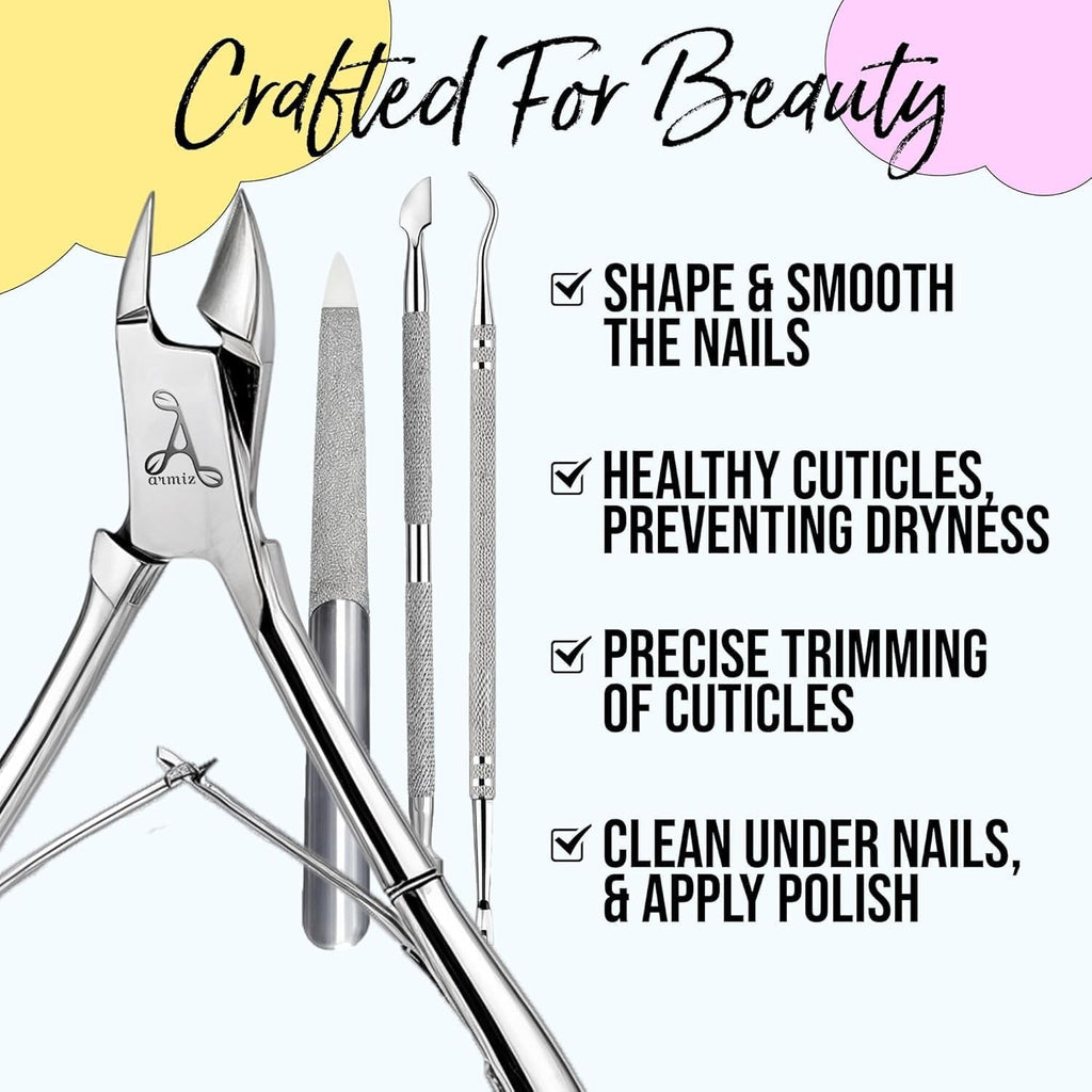 ARMIZ Juego de alicates y empujador de cutículas de 4 piezas, juego de herramientas profesionales para quitar cutículas, alicates multiusos para manicura y pedicura de acero inoxidable