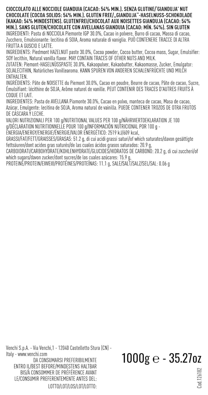 CHOCOLATE CON AVELLANAS "GIANDUJA" (CACAO: MÍNIMO 54%). INGREDIENTES SIN GLUTEN: PASTA DE AVELLANA DE PIAMONTE 30,0%, cacao en polvo, manteca de cacao, masa de cacao, azúcar, emulgente: LECITINA DE SOJA, aroma natural de vainilla. PUEDE CONTENER ALGUNAS OTRAS AVELLANAS Y LECHE.