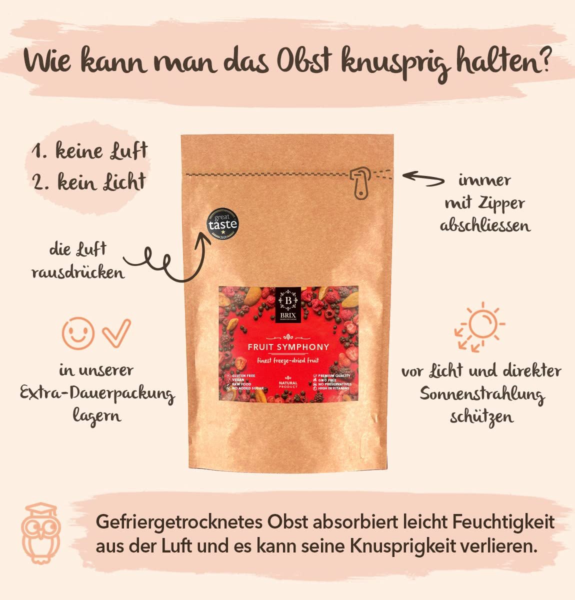 - FRUTA 100% LIOFILIZADA: ciruelas, cerezas, moras, albaricoques, grosellas negras, fresas, frambuesas y arándanos liofilizados, sin conservantes ni azúcar añadidos. La liofilización elimina el agua de la fruta. Sin embargo, se conserva su color, sabor, estructura y composición, es decir, todas las propiedades del fruto, y su sabor se vuelve más intenso. DELICIOSO SNACK SALUDABLE - Innovador snack saludable para niños y adultos. También es ideal como aderezo para muesli y batidos de desayuno. Apto para vegetarianos, veganos y crudívoros, sin gluten.