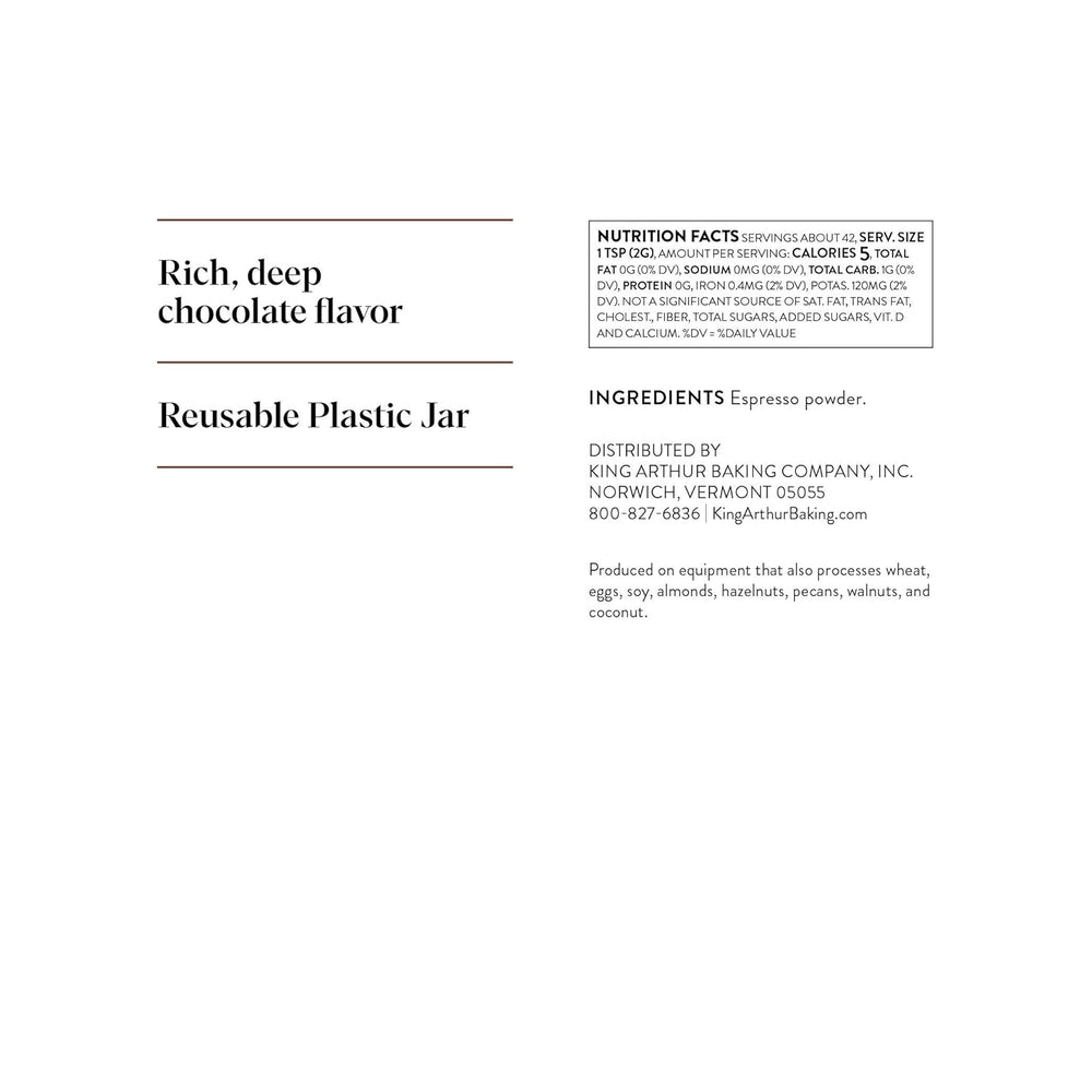 Agregue una nueva profundidad a su sabor de chocolate con el espresso en polvo de King Arthur Baking Company, un café en polvo finamente molido empaquetado en un recipiente de 85 g (3 oz). Perfecto para cocineros ávidos y aquellos que desean agregar complejidad de sabor a pasteles y postres de chocolate.