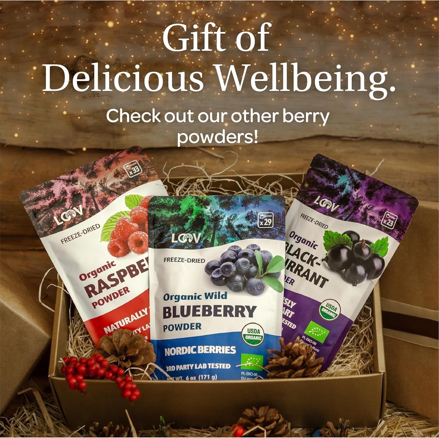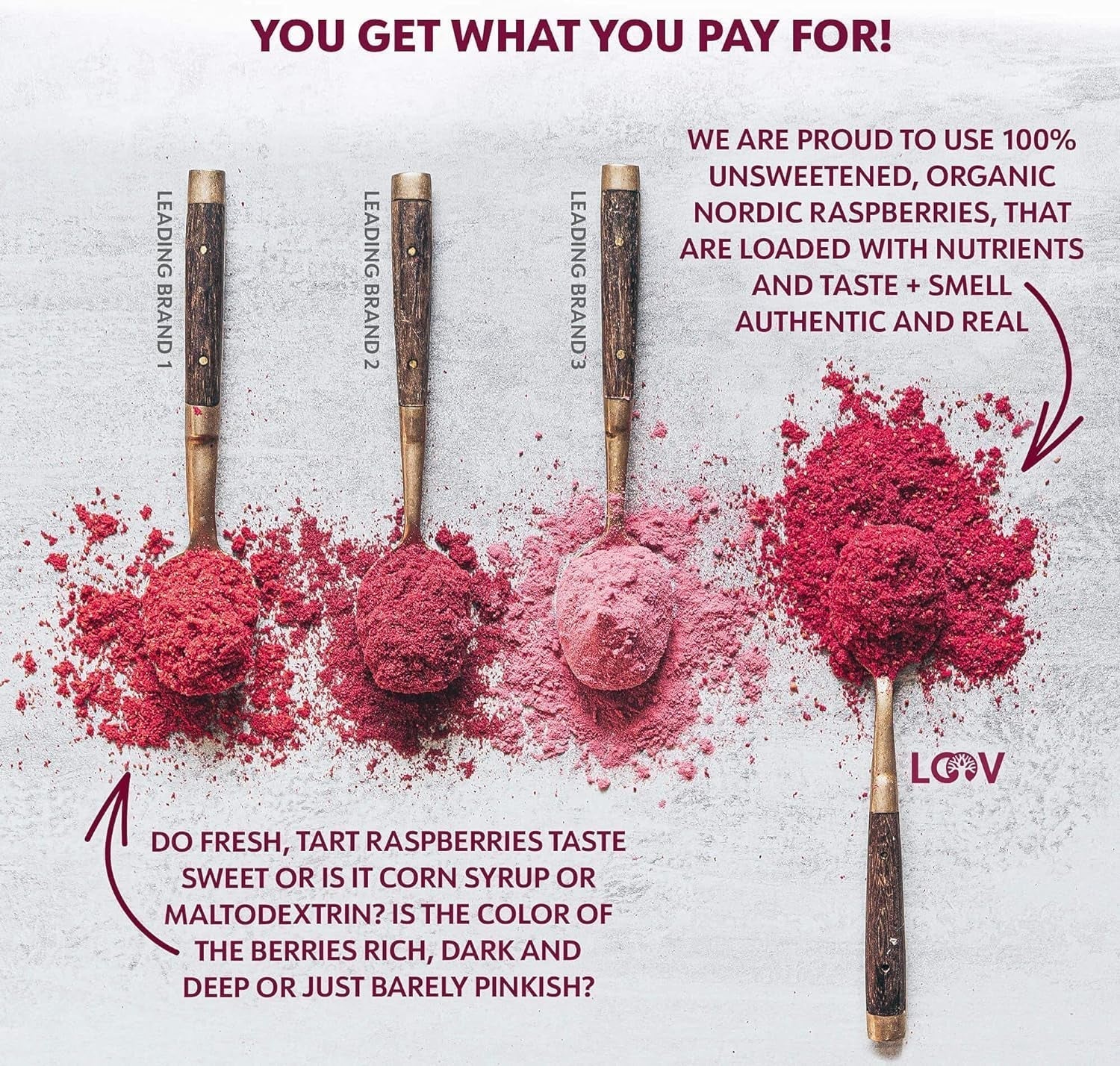 - Las bayas orgánicas de LOOV están enteras liofilizadas, lo que hace que el polvo de frambuesa sea rico en sabor, color y nutrientes. Pequeña cantidad, gran efecto: simplemente agregue una cucharada de polvo de frambuesa agridulce a su batido, avena, muesli, pudín de chía favorito o use polvo de frambuesa liofilizado para hornear.