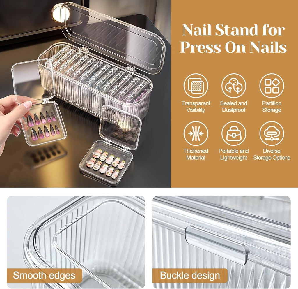 • ✔ Juego completo de accesorios para uñas: contiene 14 cajas de uñas transparentes, 1 caja de almacenamiento acrílica grande (25 x 9 x 9 cm) y 60 almohadillas adhesivas resistentes de doble cara. Perfecto para organizar uñas postizas, uñas de gel y diseños de uñas, ¡sin perder el tiempo!