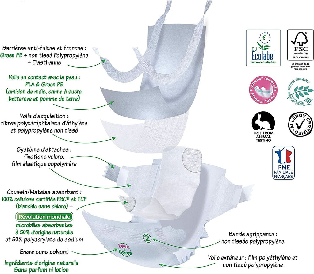 Fundada en 2011 por Céline y Gabriel, una pareja de padres jóvenes, Love & Green surge de un matrimonio. Con la llegada de su primer hijo, la joven pareja descubre un mercado de pañales dominado por grandes marcas que marcan sus propios estándares; Las autoridades sanitarias, los medios de comunicación y los consumidores no abordarían estas normas. Hubo un consenso general: el del plástico, que determina la composición de las capas del mercado, pero también las lociones a base de petróleo y colorantes...