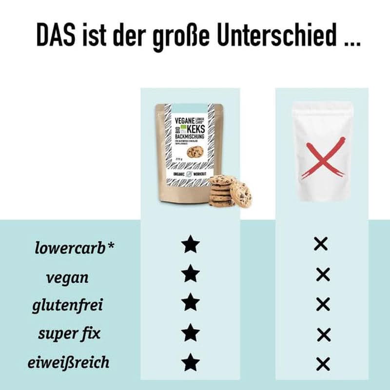 Aquí tienes tu mezcla para hornear galletas ORGANIC WORKOUT BIO VEGAN BAJO EN CARBOS para galletas con chispas de chocolate sin gluten. Súper chocolatoso, bajo en carbohidratos, alto en proteínas y sin gluten. 100% delicioso y muy fácil de preparar. La mezcla para hornear galletas es muy versátil: la mezcla para hornear galletas se puede refinar con los ingredientes que desee. Disfrútalo con arándanos hoy, manzana rallada y nueces mañana.