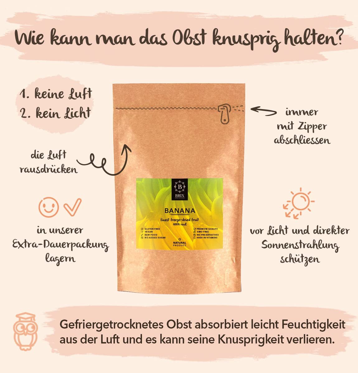 - FRUTA 100% liofilizada: plátanos liofilizados sin conservantes ni azúcar añadidos. La liofilización elimina el agua de la fruta. Sin embargo, se conserva su color, sabor, estructura y composición, es decir, todas las propiedades del fruto, y su sabor se vuelve más intenso. DELICIOSO SNACK SALUDABLE - Innovador snack saludable para niños y adultos. También es ideal como aderezo para muesli y batidos de desayuno. Apto para vegetarianos, veganos y crudívoros, sin gluten.